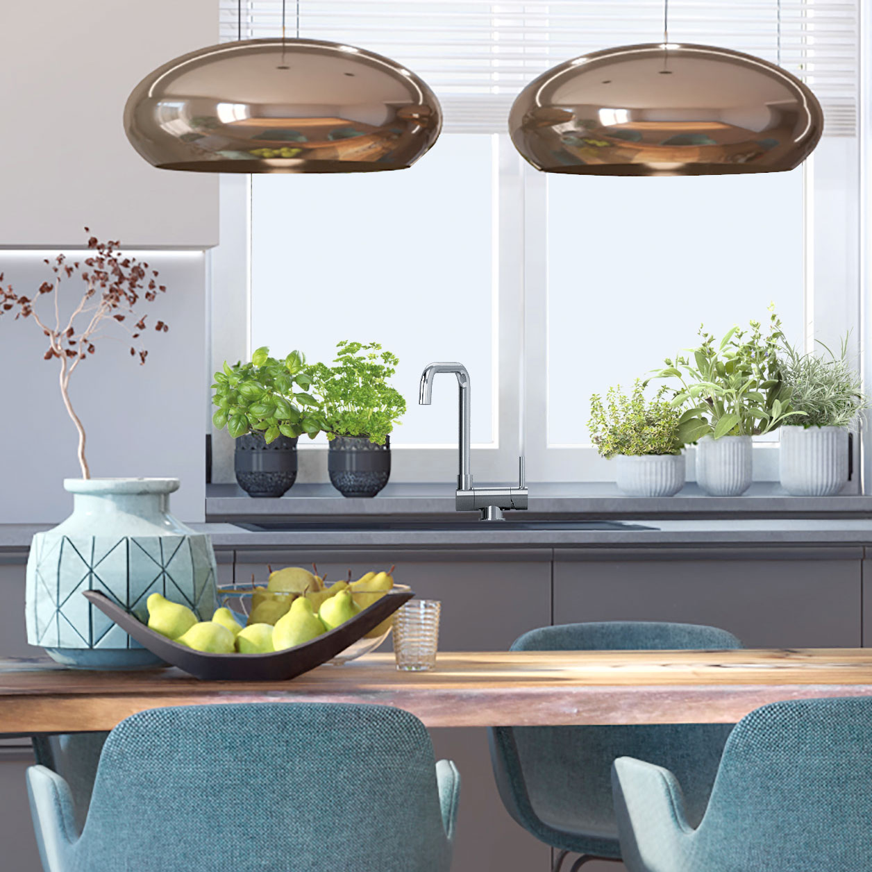 Jednoručna slavina za sudopere koje su postavljene pod prozorom.