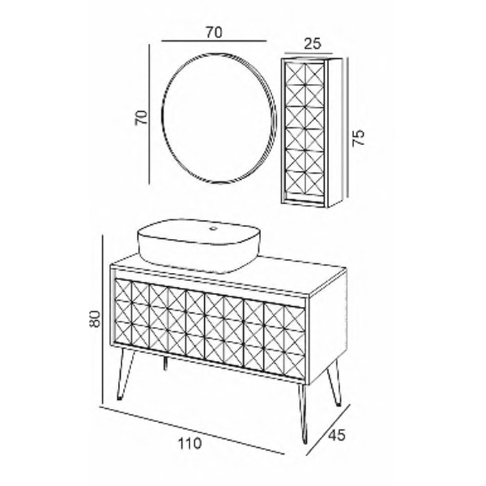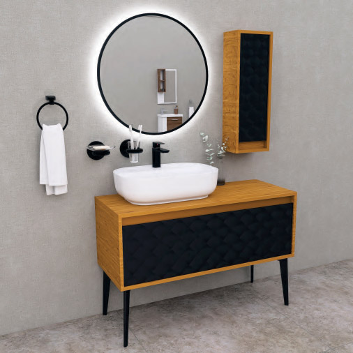 Gornja lakirana medijapan ploča otporna na habanje, sa keramičkim umivaonikom bele boje. Prednja i bočna stranica, lakiranao, mat. Vertikala, viseci ormaric za montazu na zidu pored ogledala. Ogledalo sa led rasvetom, okruglo