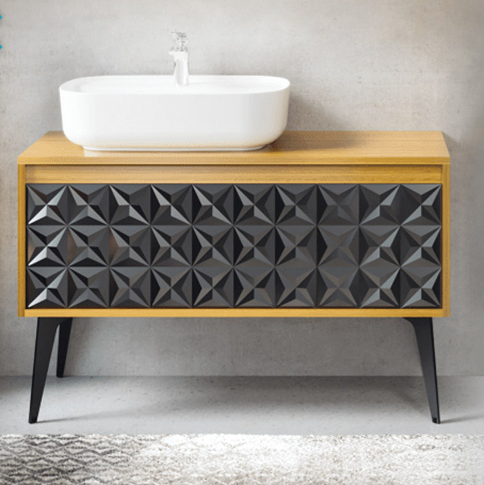 Boja/dezen: bela (umivaonik), boja drveta (hrast) sa crnim detaljima, lakirano, sjajna.