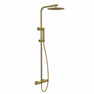 Copen Nook okrugli tuš set u brušenom zlatu uključuje bateriju, šipku usponskog tuša, tuš ružu, tuš ručicu i crevo, savršeno kombinovane za moderan izgled i dugotrajnu upotrebu.