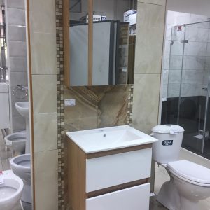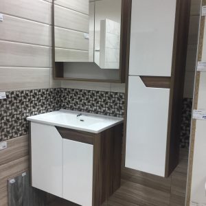 Praktična komoda za kupatilo iz asortimana Mirekla Keramika. Sastoji se od tri dela: gornjeg dela sa vratima, fioke u sredini i donjeg dela koji može biti sa korpom za veš ili samo sa policom, takođe sa vratima.